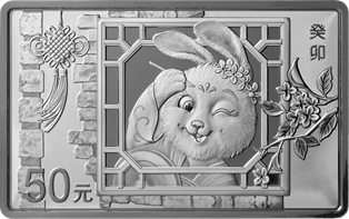 150克長方形銀質紀念幣及30克扇形銀質紀念幣背面圖案均為卡通兔造型,襯以桂花、中國結、窗等組合設計。